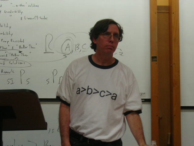I think Temkin’s shirt, stating “a>b>c>a”, points to a serious flaw in his assertion number (1). Why should it be necessary that there be any ordering principle on the set of all possible worlds in which things are ‘bad’? Why can’t there be one or several tests of “unfairness” that all yield well defined results (we know what we mean) without any notion of the unfair worlds being more or less bad than each other?