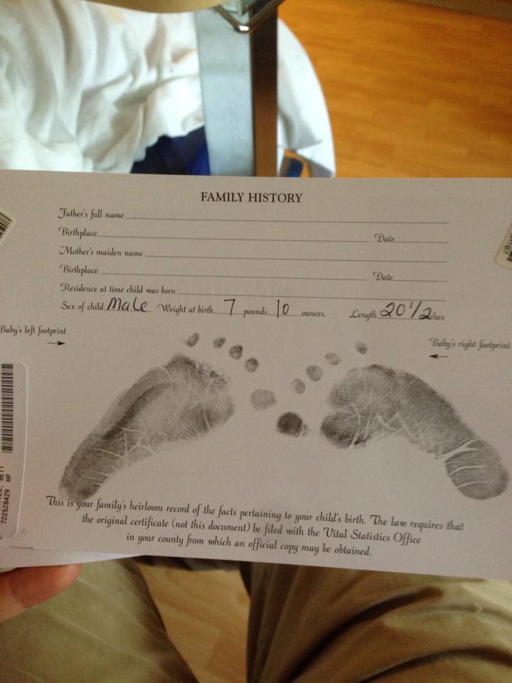 Some time after that, I sent that text – “So we just had a scare…”, probably near 7:30am. Noelle had just left (but promised to call us to follow up in a few hours, which she did). We were left holding a piece of paper on which they had made Sam’s footprint impression. I sat there looking at it, thinking this was all we had, that our son wouldn’t make it, this was all that would be left. I texted a picture of it to my family.